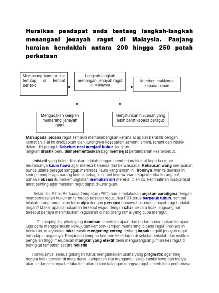 Dengan itu, semua pihak harus berganding bahu untuk mengatasi masalah jenayah ragut dengan secepat mungkin, bak kata pepatah, bagai aur dengan. Selain itu , kesedaran orang ramai sendiri dengan berusaha untuk menjaga keselamatan diri pada setiap masa.salah satu langkah untuk mencegah kejadian ragut adalah dengan mengelak diri berjalan seorang di kawasan yang sunyi dan gelap. Jika pbt terus berpeluk tubuh, sampai bilakah orang ramai akan terus alpa dengan persepsi bahawa hukuman jenayah ragut adalah ringan? Tuntasnya, banyak langkah yang boleh dilaksanakan bagi menangani jenayah ragut di malaysia. Tulis cara/ langkah mengatasi masalah ragut.