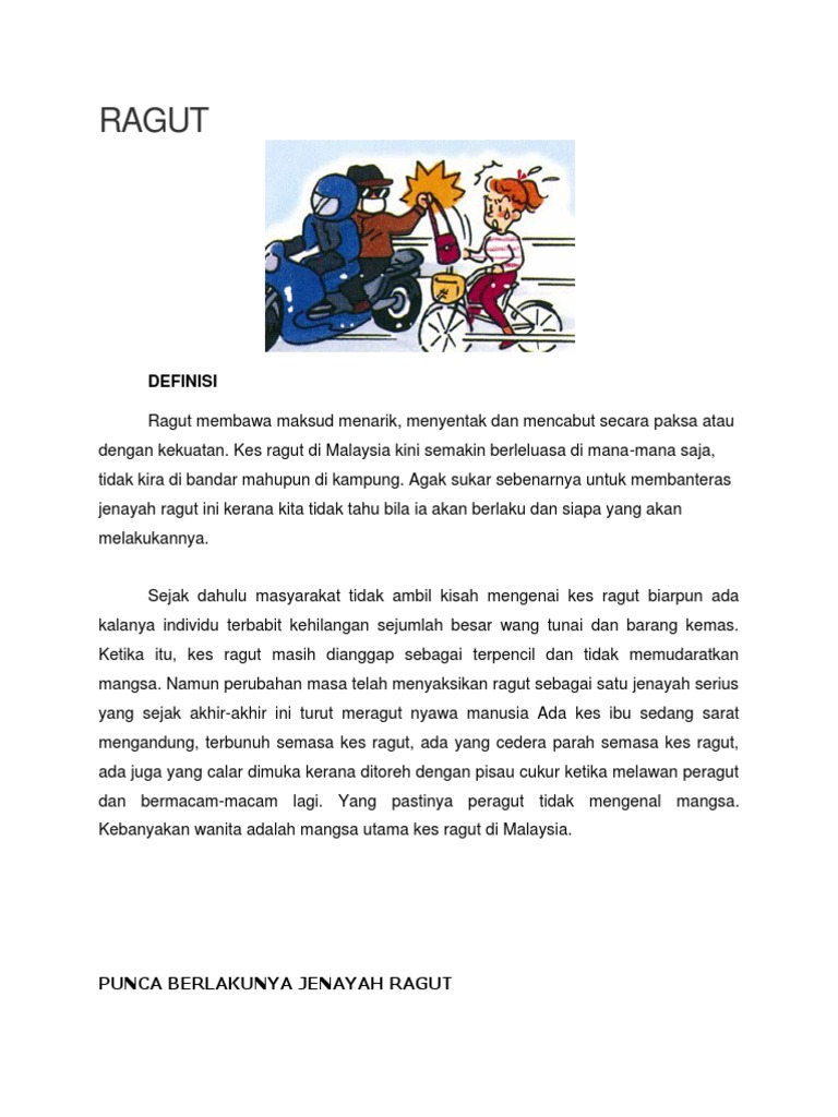 Langkah Mengatasi Jenayah Ragut from imgv2-1-f.scribdassets.com Selain itu , kesedaran orang ramai sendiri dengan berusaha untuk menjaga keselamatan diri pada setiap masa.salah satu langkah untuk mencegah kejadian ragut adalah dengan mengelak diri berjalan seorang di kawasan yang sunyi dan gelap. Ragut adalah jenayah yang agak baru, melibatkan penunggang motosikal,biasanya penagih dadah. Dengan itu, semua pihak harus berganding bahu untuk mengatasi masalah jenayah ragut dengan secepat mungkin, bak kata pepatah, bagai aur dengan. Jenayah ragut haruslah diatasi oleh semua pihak dengan memberi kerjasama dan menjalankan. Selain itu, antara inisiatif yang dapat kita ambil sebagai langkah mencegah jenayah yang merupakan isu terpenting di negara ini ialah dengan mewujudkan konsep bandar dan pekan selamat. Sudah sampai masanya wanita memberi perhatian serius terhadap perkara ini dan mengambil langkah. Banyak wanita yang bingung bagaimana cara mengatasi keputihan yang tepat. Kes ragut ini akan menimbulkan banyak masalah dan mengancam nyawa masyarakat.